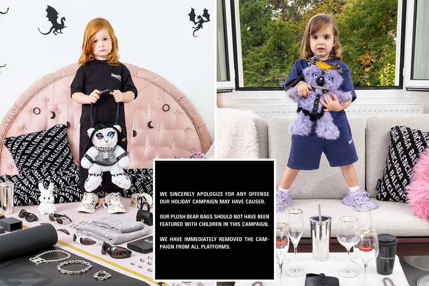 Their SS23 advertisements show two young girls posing with wine glasses and teddy bears that appear to be wearing BDSM-style harnesses, with some people on X noticing an excerpt of a US Supreme Court case that upheld a federal child pornography law. They immediately apologized, noting the children shouldn’t have been included in the shoot — but should teddy bears really be wearing bondage of this nature anyway? Celebrities and fashion darlings began to consciously uncouple from the brand and its creative director, much of the world following suit.
